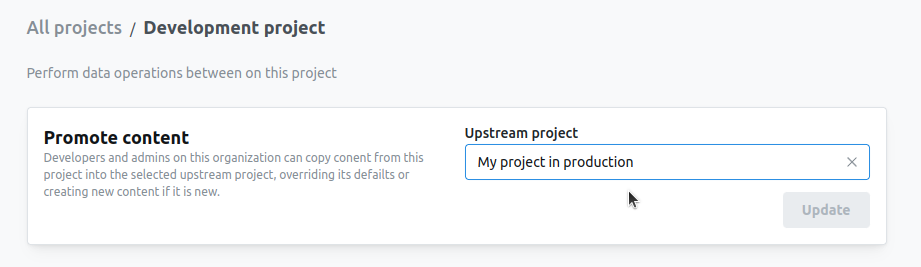 Before you can start promoting content, you need to configure your upstream project. To do this, on yourdevelopment project go to settings > Data ops.